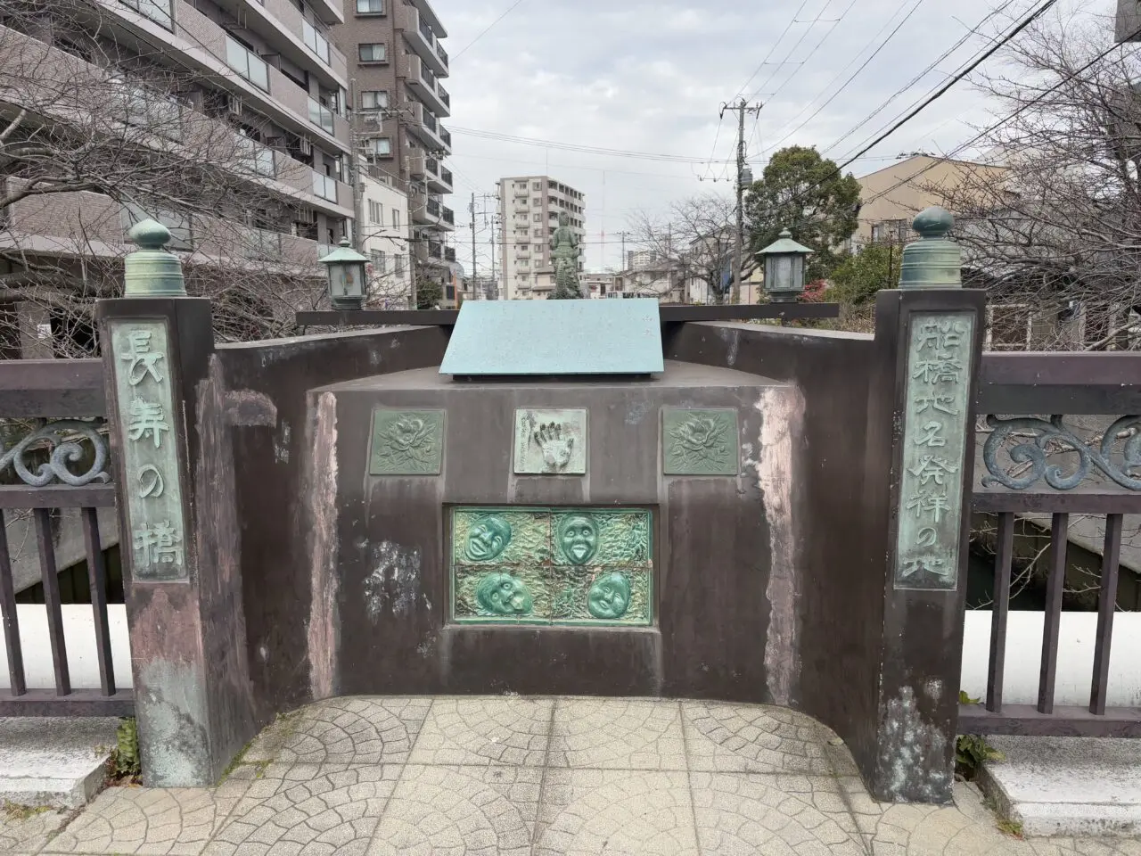 本町通りにある「長寿の橋」。海老川にかかり、船が橋から突き出ているようなデザインや、船橋で昔から受け継がれている「ばか面踊り」の面のオブジェなどもみることのできる、名所のひとつとも言える場所ですね。