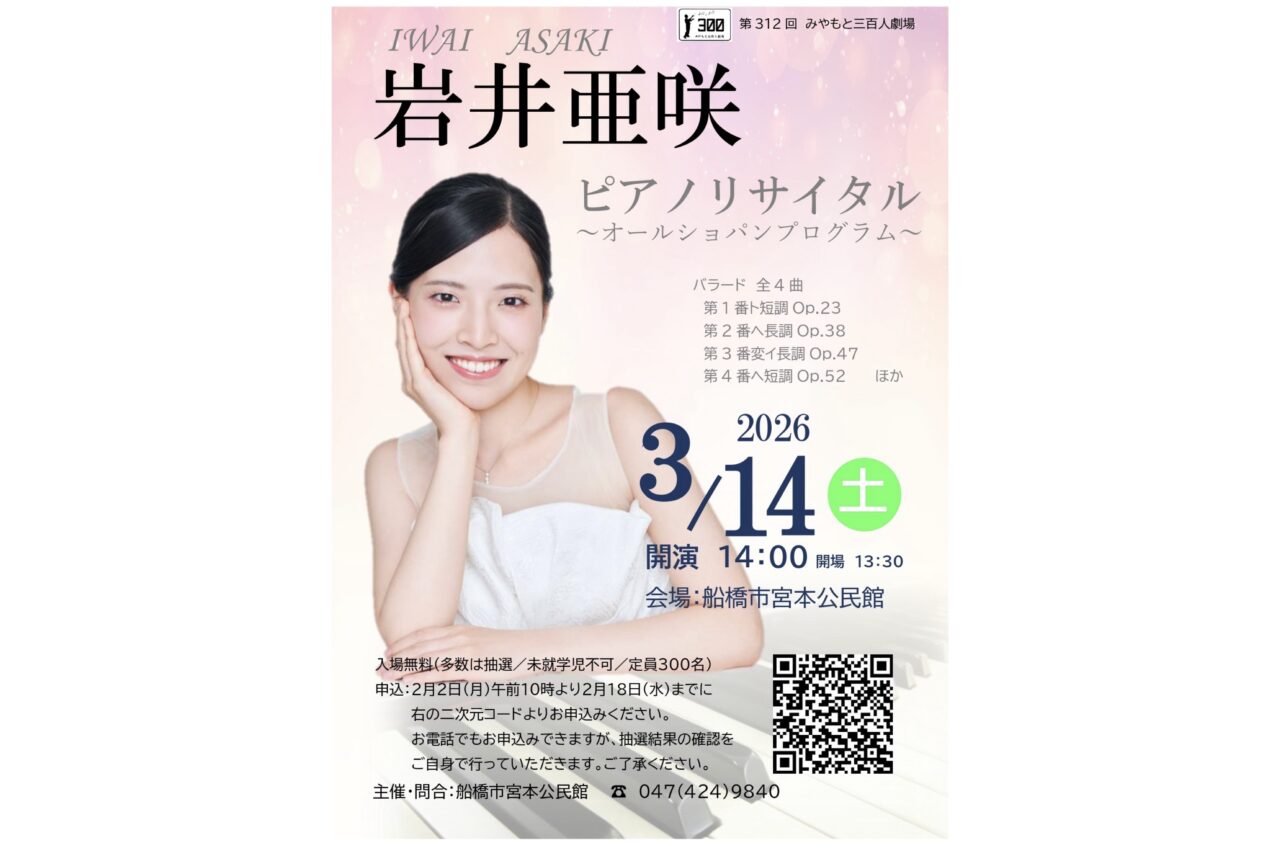 【船橋市】宮本公民館でホワイトデーに開催。「岩井亜咲ピアノリサイタル~オールショパンプログラム~」の申し込みは2月2日から。