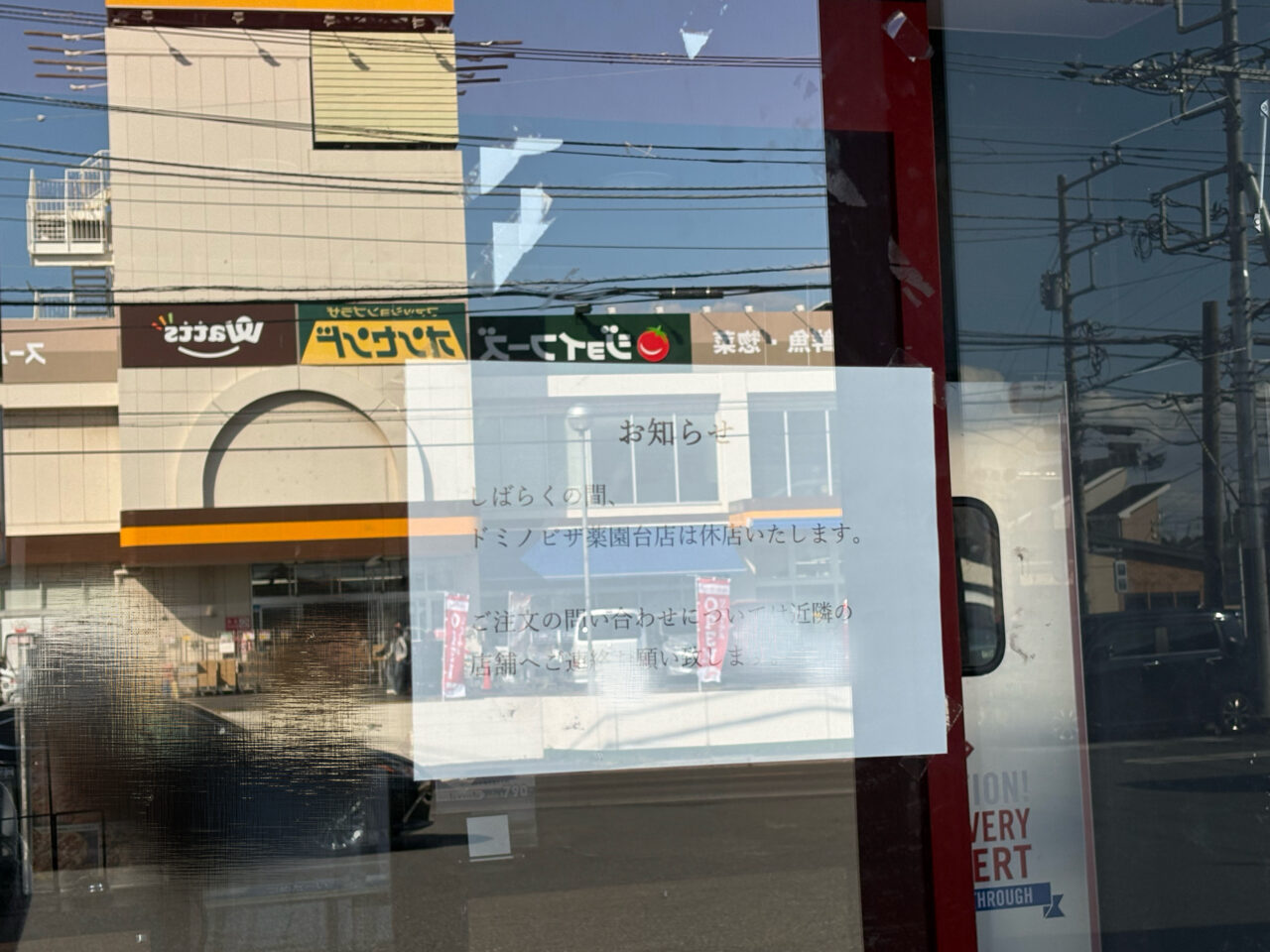 前を通り掛かった際に、営業しているようすがなかったので、店頭の貼り紙を見てみると…「しばらくの間、ドミノピザ薬園台店は休業します」とのお知らせが。注文の問い合わせは近隣店舗へとのことで、市内には船橋新高根台店や船橋湊町店、馬込沢店があります。