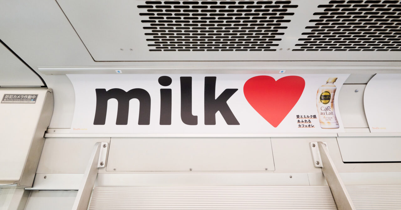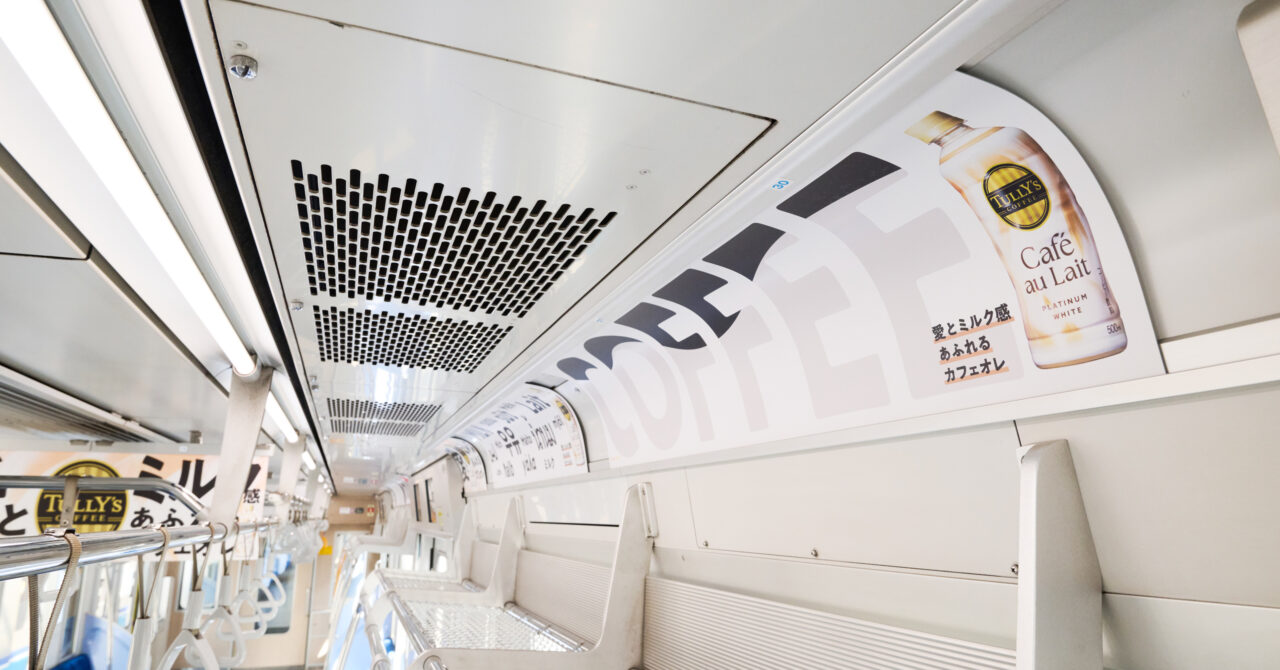 中吊りや窓上などいたるところでミルクを想起させるホワイトやカフェオレ色を基調とした特別感あるビジュアルを掲出。