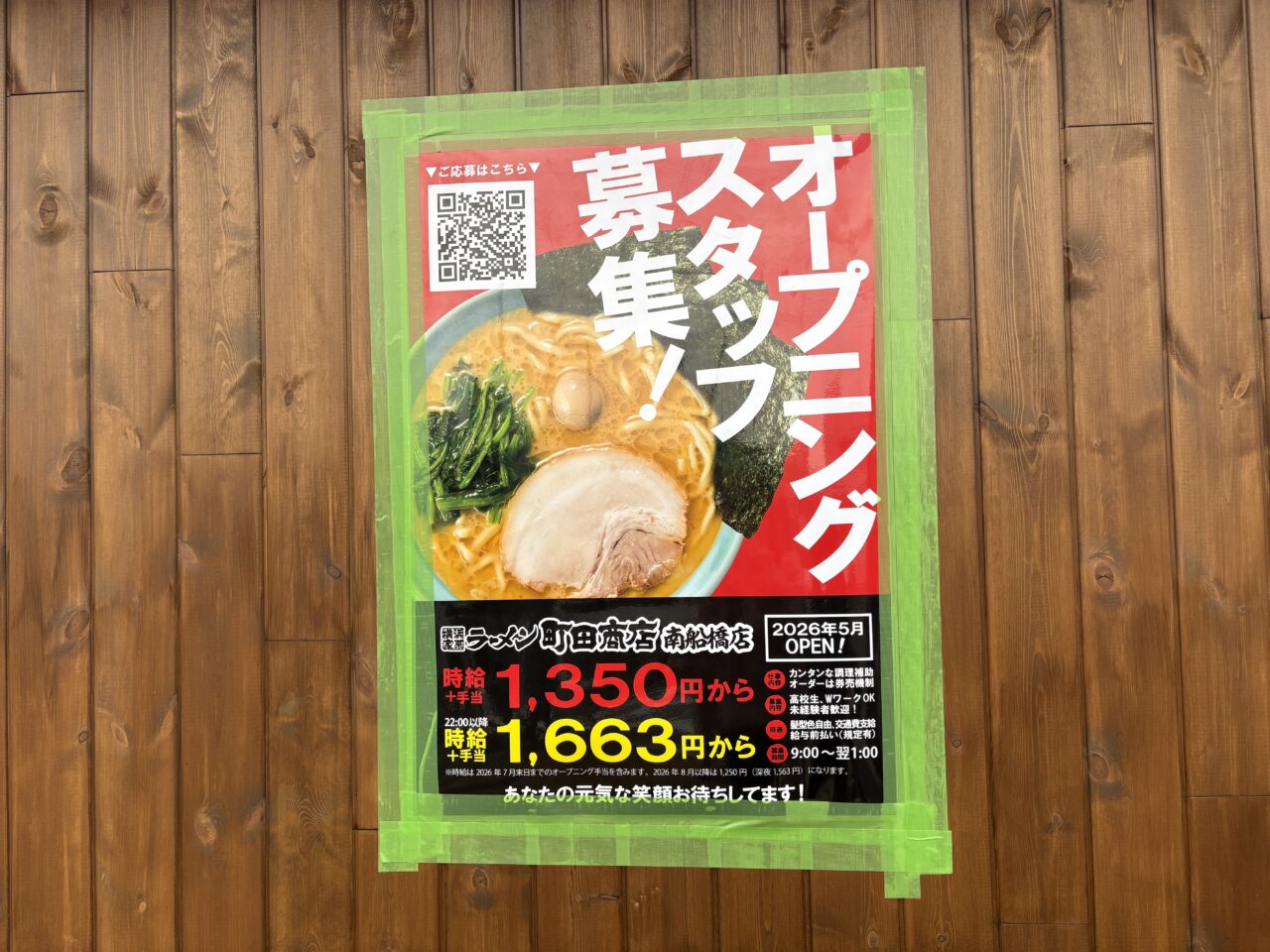 醤油ダレと豚骨のクリーミーな美味しさでファンの多い町田商店。店頭のポスターによりますと、開店は2026年5月予定とのこと(写真は3月下旬撮影)。まだ公式ホームページなどでの発表は見つけられず、オープン日の詳細などはわかりませんでした。