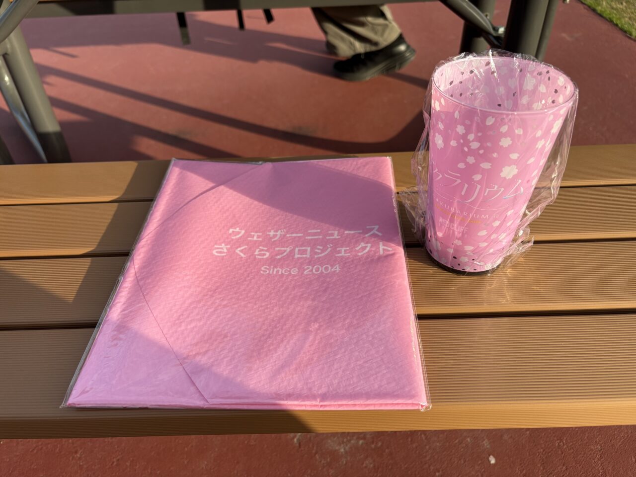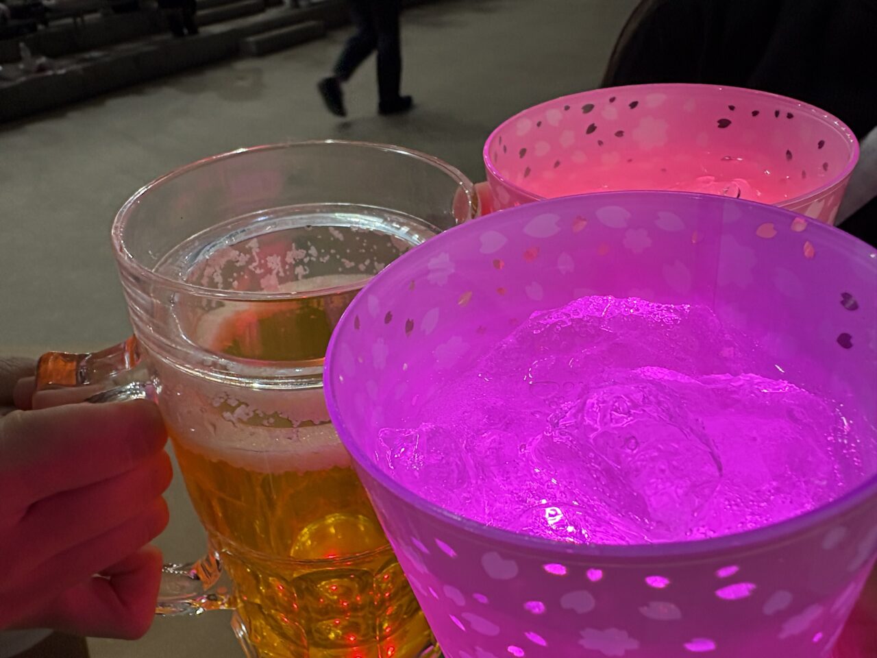 来場者には、ウェザーニュースとコラボした花びら型レジャーシートと、ドリンクを入れると発光する桜のカップがプレゼントされ、あちこちで桜が咲いているような華やかな雰囲気に。